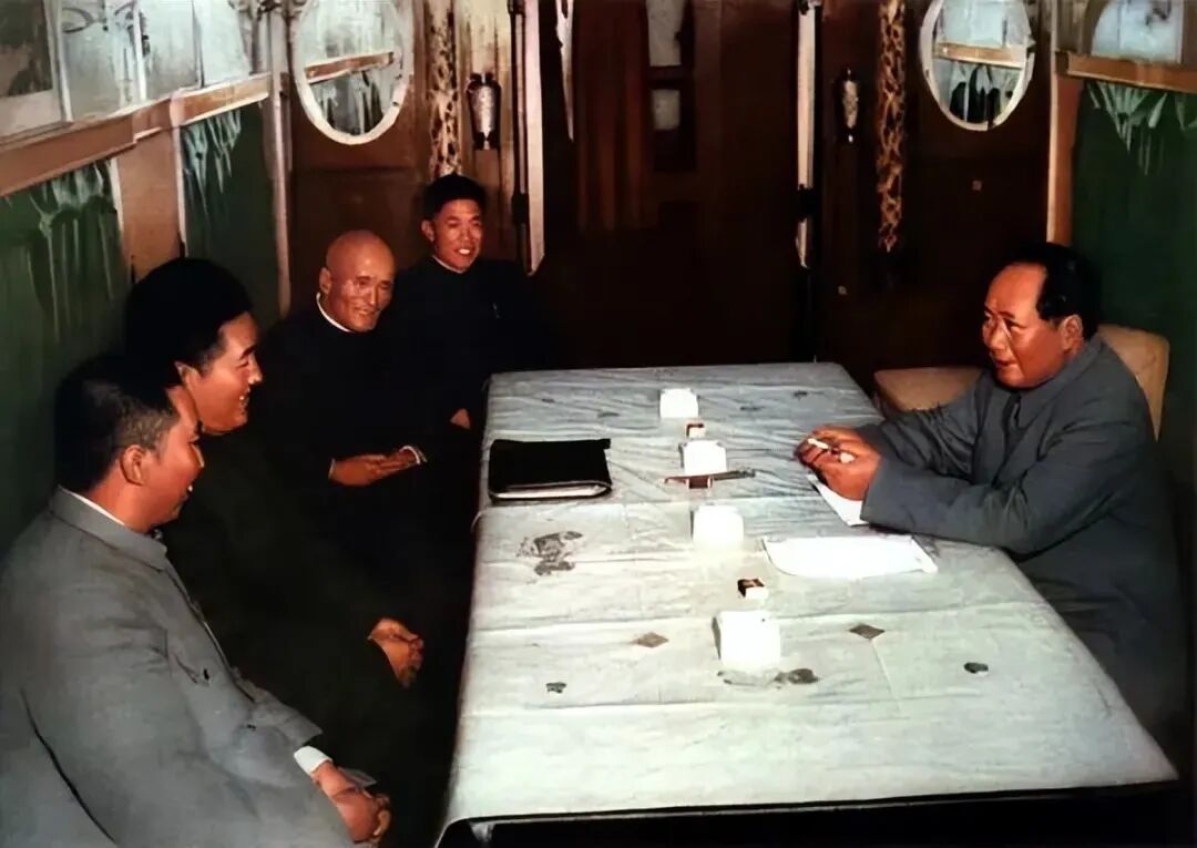 1955年,主席在视察途中,经过长沙期间,在火车上与湖南省委主要负责人亲切交谈。左一为时任湘潭县委第一书记的华国锋。这是华国锋与主席的第一次见面。(思想者书店编辑)