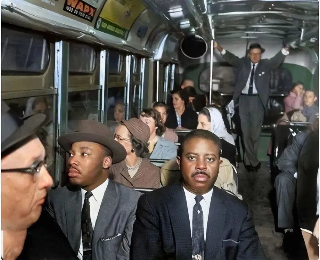 1956年在美国拍摄的照片,照片中靠窗戴帽子的黑人叫马丁·路德·金,他是一名牧师。他乘坐的这辆公共汽车是美国第一辆取消种族隔离的公共汽车。(思想者书店编辑)