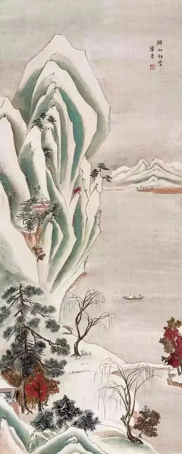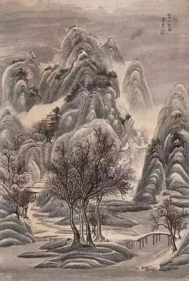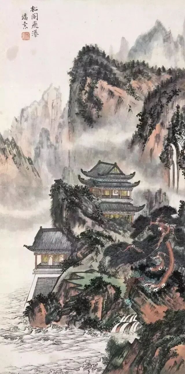 但天资聪慧的潘素做到了,尤擅长工笔重彩山水画,承继了细密严谨,金碧绯映的一派。