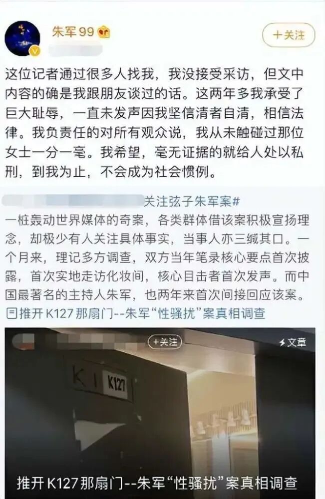 当时在网上引起轰动后,网友一边倒维护弦子,将她看作受害女性,丝毫没有怀疑她别有用心,而朱军则从“央视名嘴”一下沦为人人喊打的“衣冠禽兽”,甚至不能在央视正常工作。