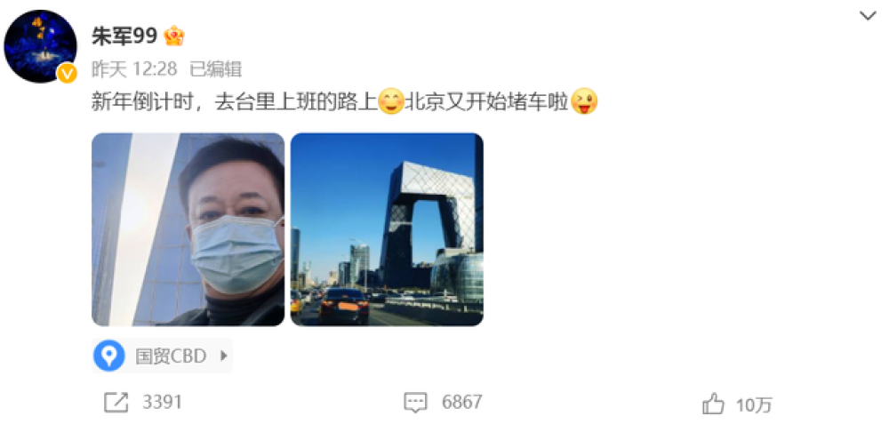 12月29日,朱军晒出自己与央视大楼的合影,并表示去台里上班,即使上班的路上堵车也难掩好心情。