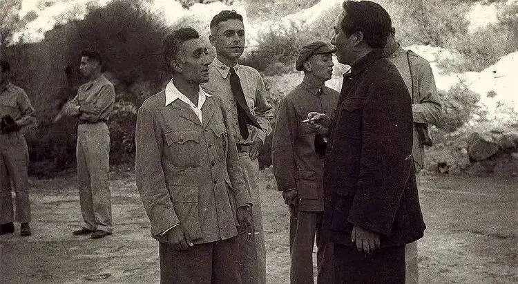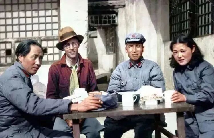 1937年3月,与美国合众社驻天津记者厄尔利夫、朱德,女翻译吴光伟于延安。