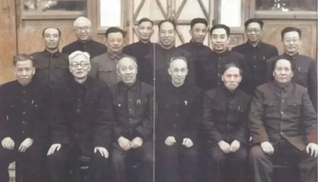 在这张照片中,最为罕见的是,主席没有出现在C位(中间位置),而是坐在前排最右侧,这种情况非常少见,而少奇同志坐到了前排最左侧,总理则站到了后排。