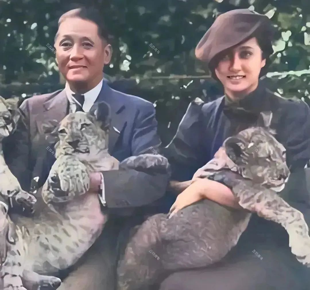 40年代蒋百里和他的女儿蒋英坐在长椅上,父女二人怀中各抱一只小狮子。