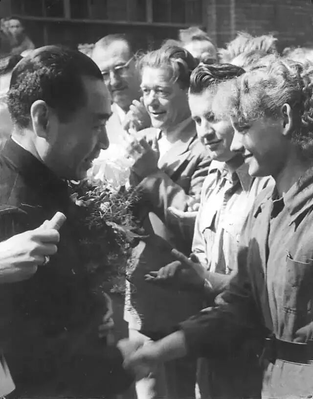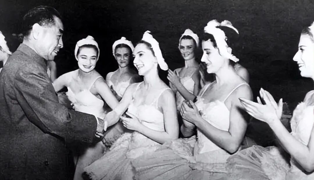 1957年周恩来在莫斯科大剧院感谢参加芭蕾舞“天鹅湖”表演的演员。