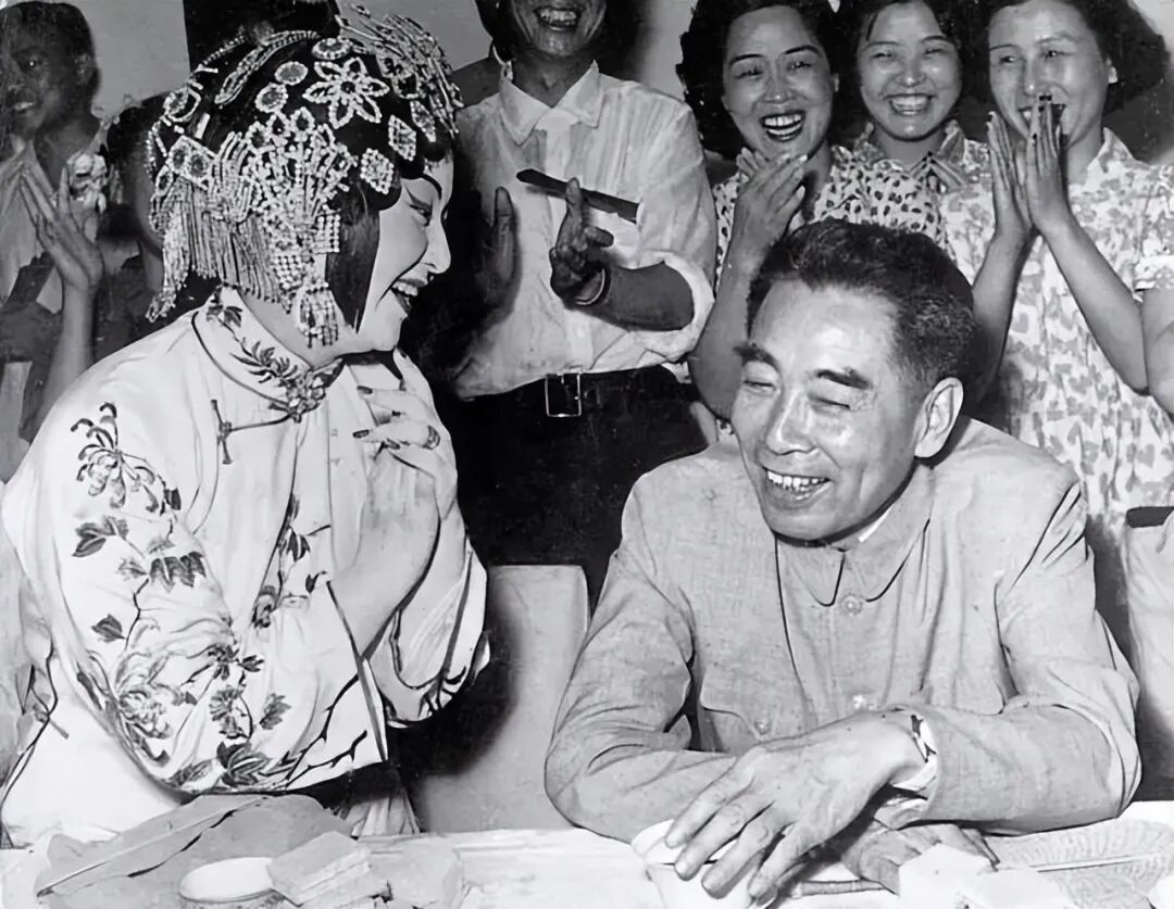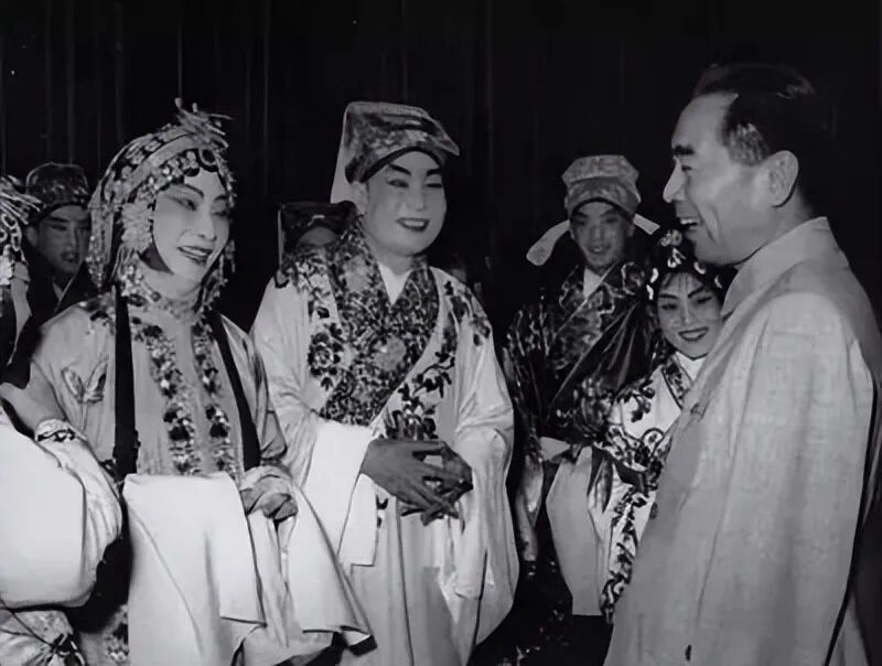 1957年7月,周恩来观看北方昆曲剧院和著名表演艺术家梅兰芳(左二)的演出后,与艺术家们交谈。