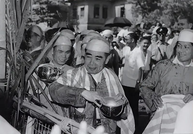 1960年4月,周恩来访问缅甸时,与当地人共度泼水节。身着缅甸民族服装,手持银碗,撒着水。