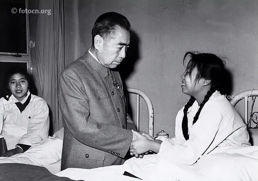 1966年周恩来总理来到空军总医院慰问第八次被接见而挤伤的红卫兵小将们。