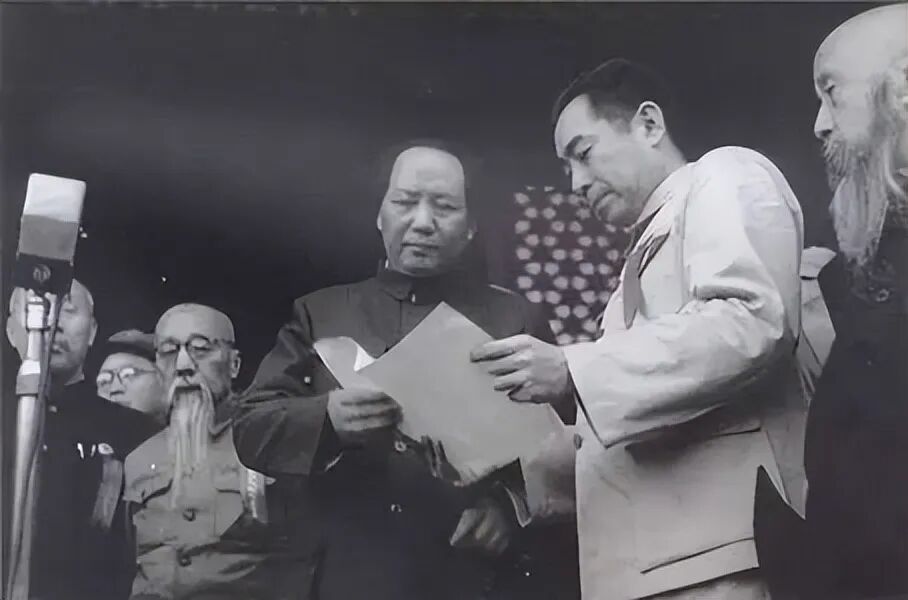 1949年10月1日下午,开国大典,毛泽东、周恩来在天安门城楼上。