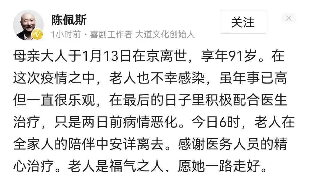 刚刚陈佩斯发文,他的母亲因感染新冠,于1月13日离世,享年91岁。不同于一般人对亲人因为新冠离世而愤愤不平,陈佩斯表现出来的是平和,甚至感恩。他说自己的母亲在配合医生治疗的时候很乐观,走得也很安详。陈佩斯最后感谢医务人员的精心治疗,说母亲是福气之人。陈佩斯的大胸怀令人敬佩,或许人活到一定年岁,就真的能看透悟透。我们都只不过借了一副皮囊,来人间大闹一回,曲终人散就开开心心走了,如此而已。