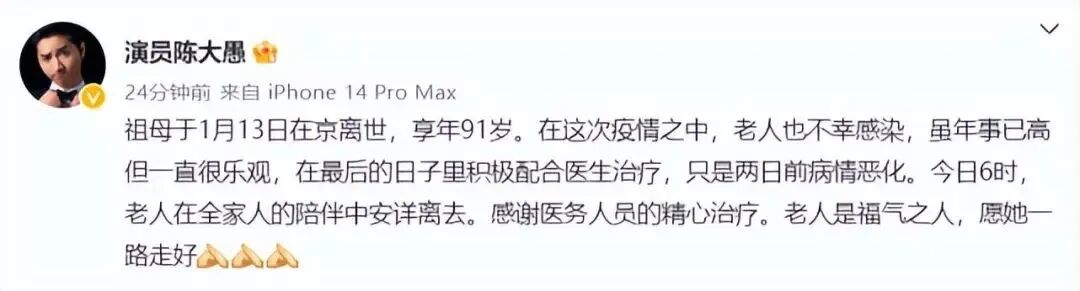 或许是因为年事已高的缘故,老人家的病情还是没得到有效遏制,前两天病情突然恶化,于13日早上6点在全家人的陪伴下辞别人世,对此作为孙子的陈大愚也表示,祖母是有福之人,在如此高龄可以平和安详地离开,他也特意感谢了医护人员。