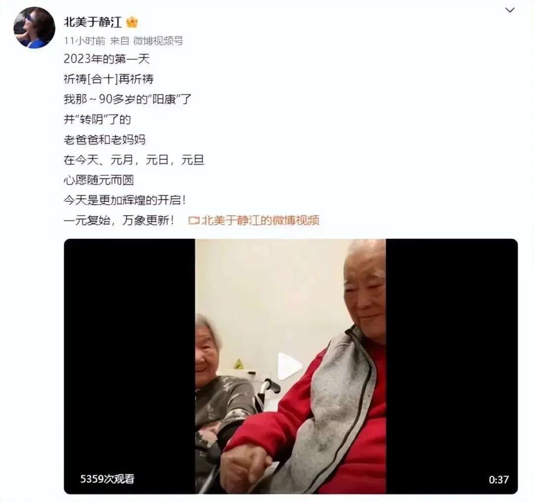2023年新年第一天,著名表演艺术家于洋、杨静夫妇的女儿于静江发文:“2023年的第一天,祈祷再祈祷。我那90多岁的‘阳康’了并‘转阴’了的老爸爸和老妈妈,在今天、元月,元日,元旦,心愿随元而圆。今天是更加辉煌的开启!一元复始,万象更新!”