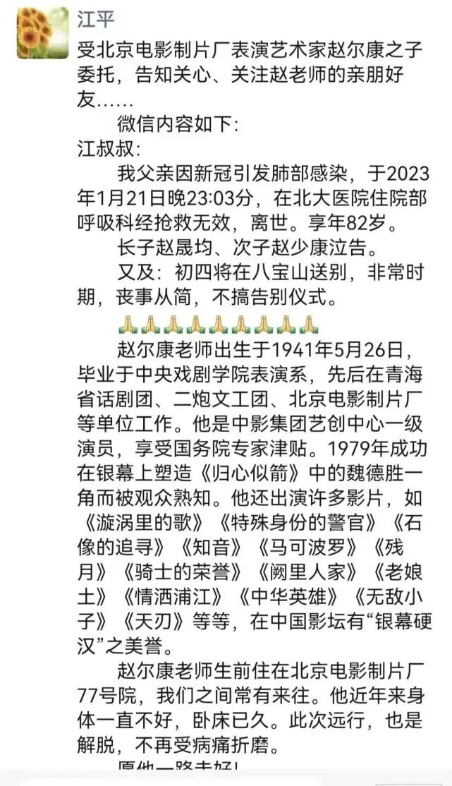 从中得知,赵尔康老师是因新冠引发肺部感染,于21日晚23点03分在北大医院住院部呼吸科经抢救无效离世,长子赵晟均、次子赵少康泣告。