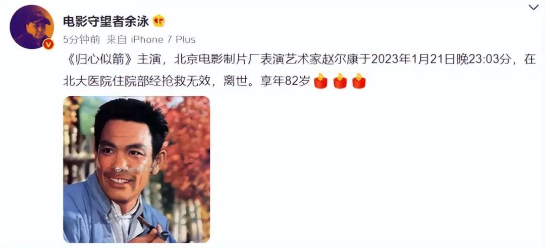 1月23日,据电影守望者余泳透露,北京电影制片厂表演艺术家、国家一级演员赵尔康于21日除夕夜去世,享年82岁。