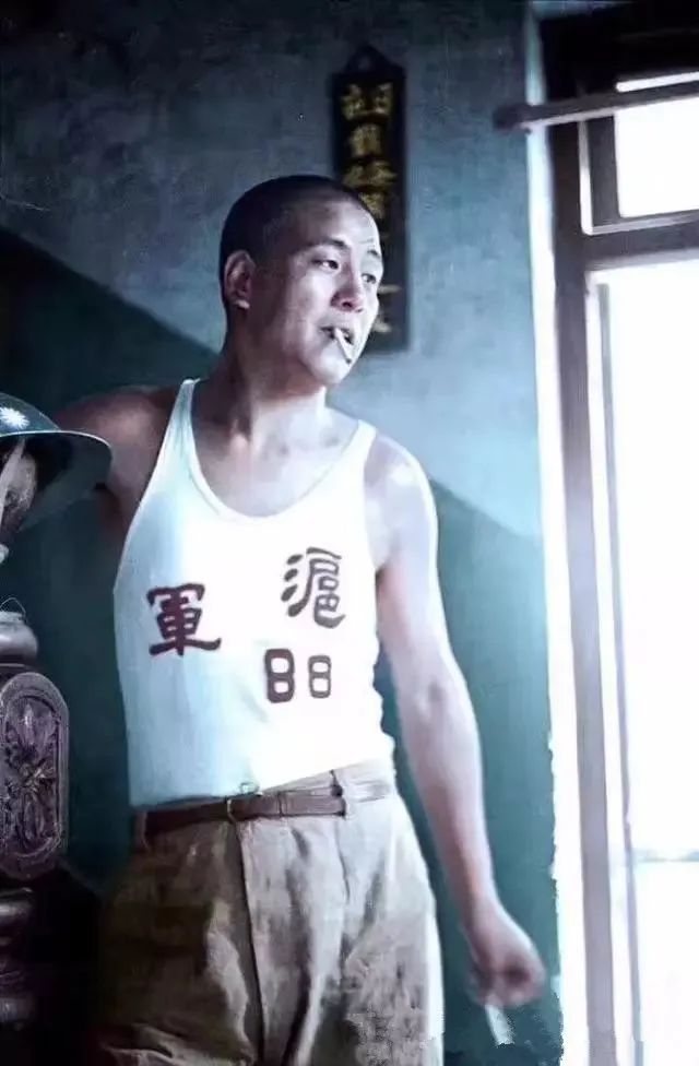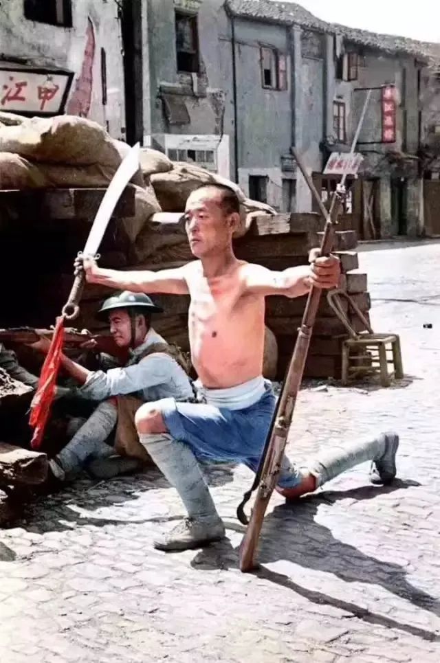 八·一三淞沪会战期间,一国军士兵在街头锻炼。(另一说正在赤膊与日军搏杀)