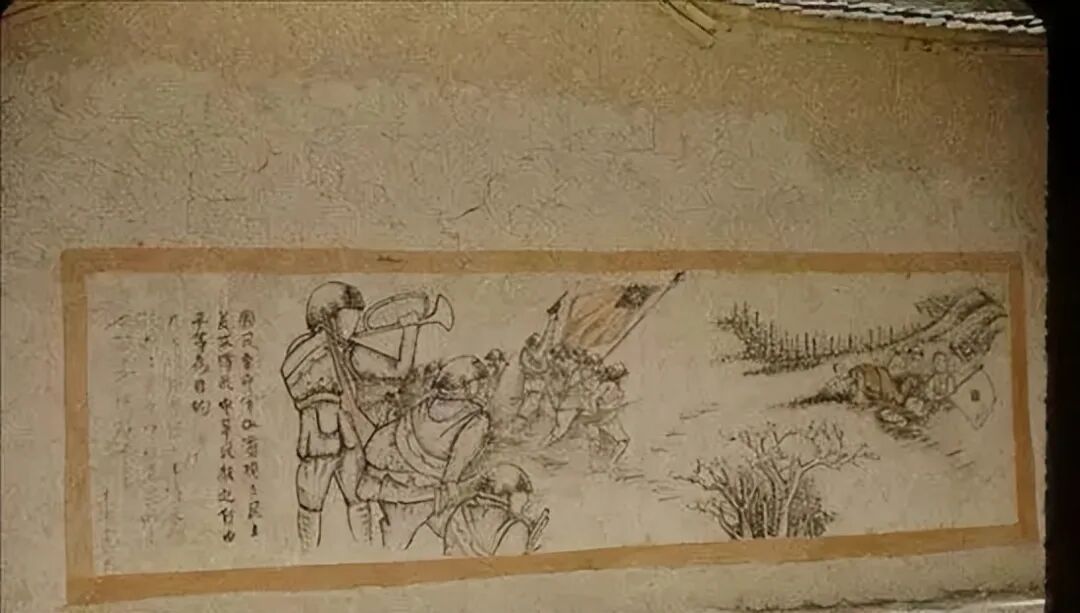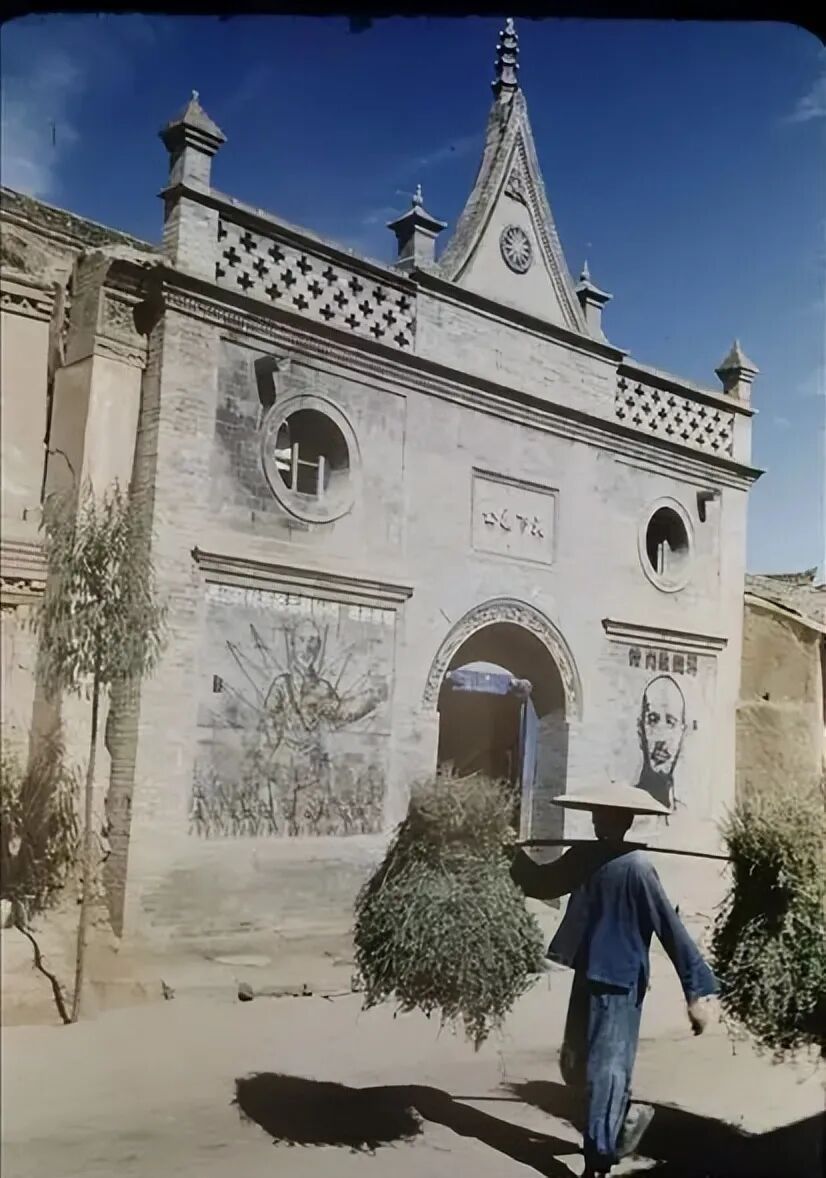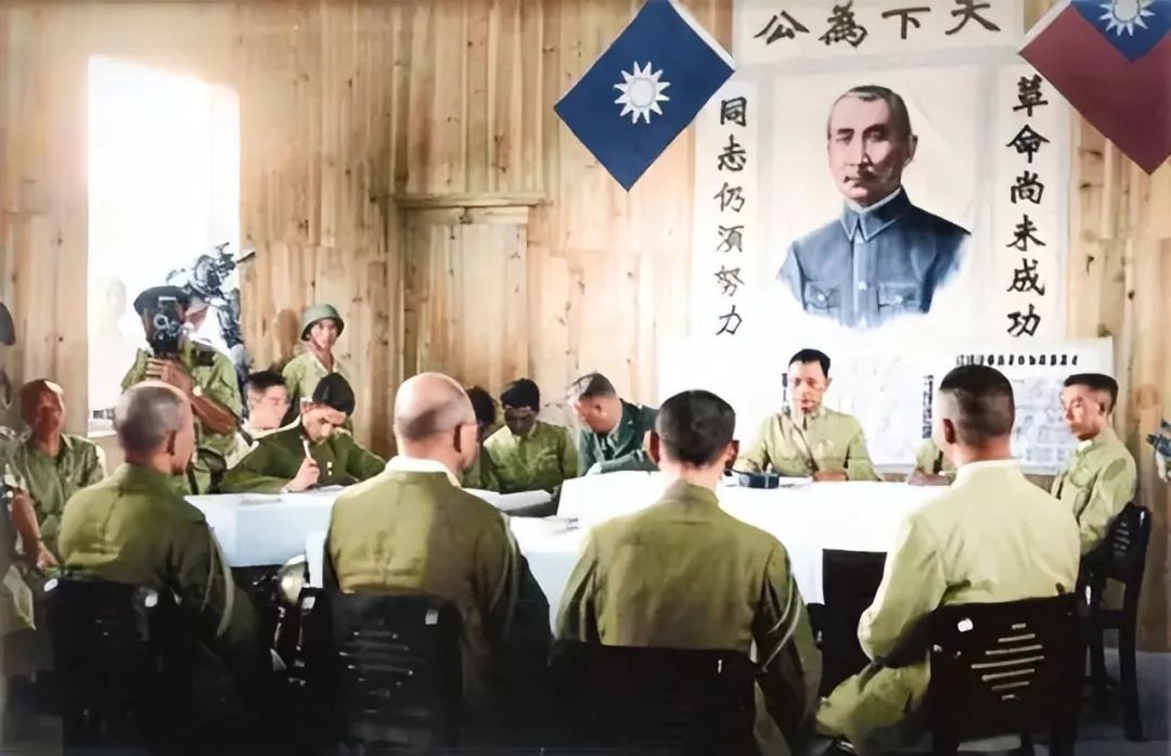国军指挥所。尖顶部位有“青天白日”徽章,大门上方有“天下为公”的匾额,墙上有蒋介石的画像。