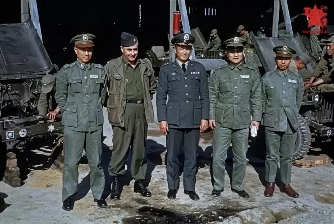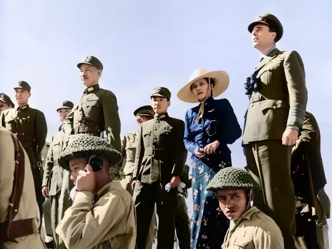 1943年12月,蒋介石、宋美龄夫妇在检阅完于印度兰姆伽训练的中国驻印军后观看部队演练。站在战壕上方从左至右分别为中国驻印军军长郑洞国、蒋介石、蒋纬国、宋美龄和盟军驻东南亚总司令蒙巴顿将军。蒋纬国此前已经在此基地训练多时,参与自行火炮的稳定器维护工作。