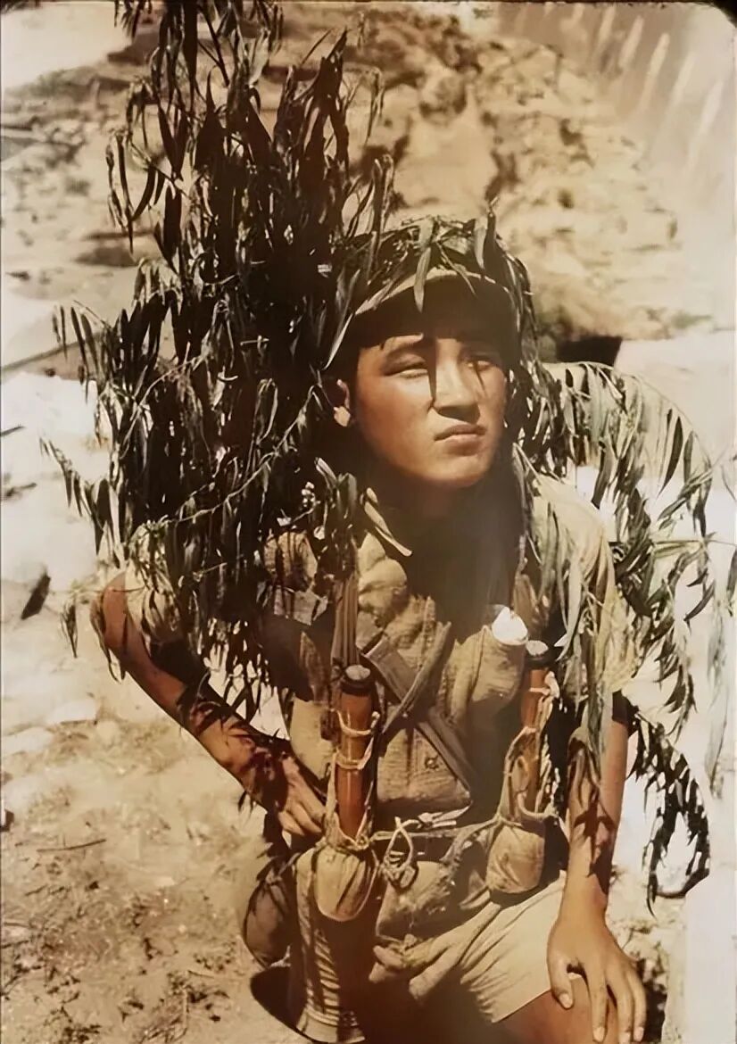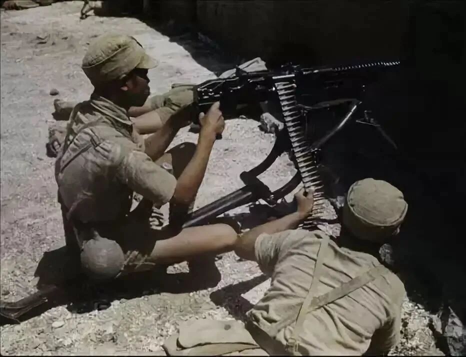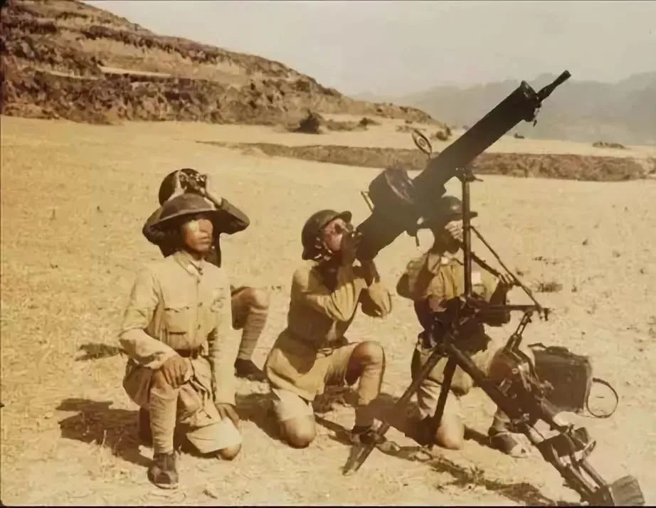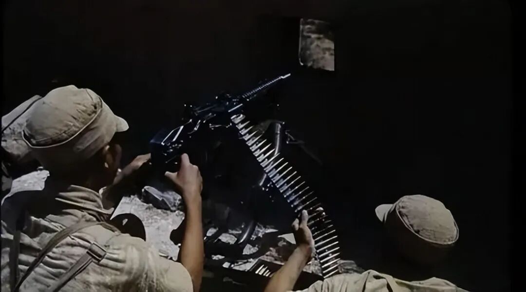 依托工事使用重机枪向敌军扫射的国军士兵。