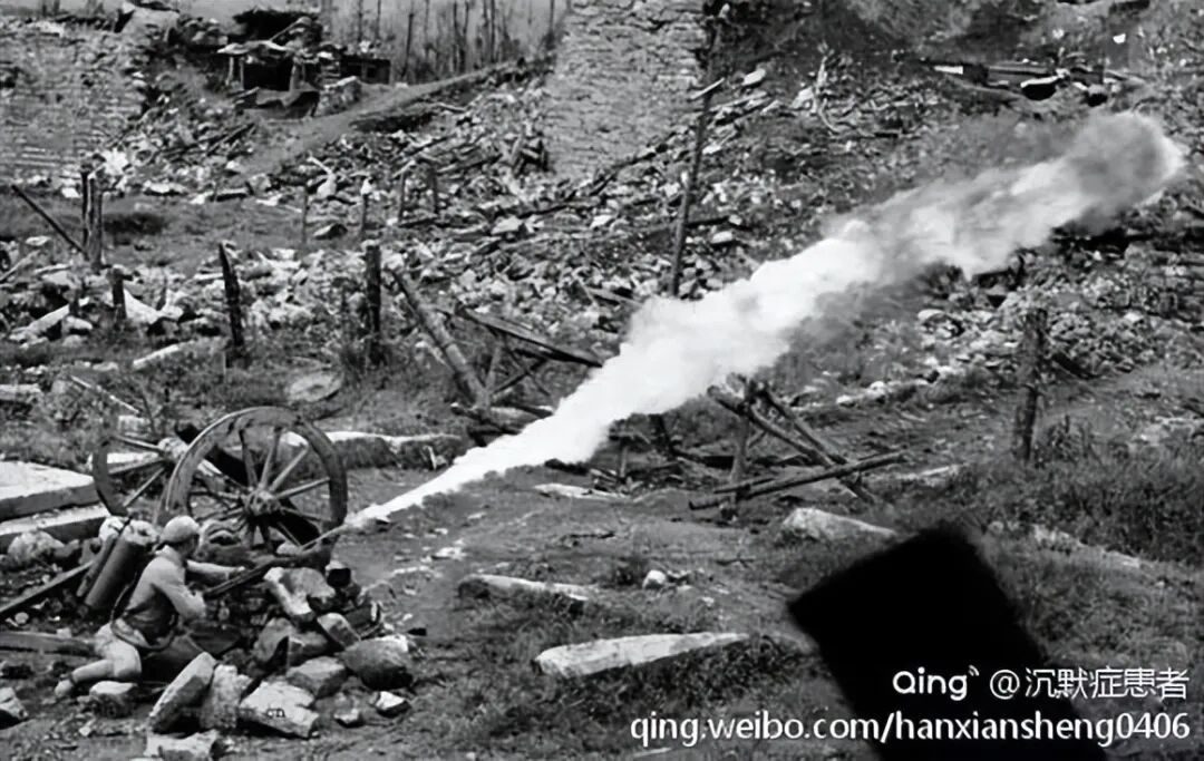 1944年10月4日,云南腾冲,1名中国士兵在使用火焰喷射器攻击日军碉堡。