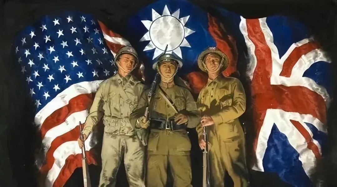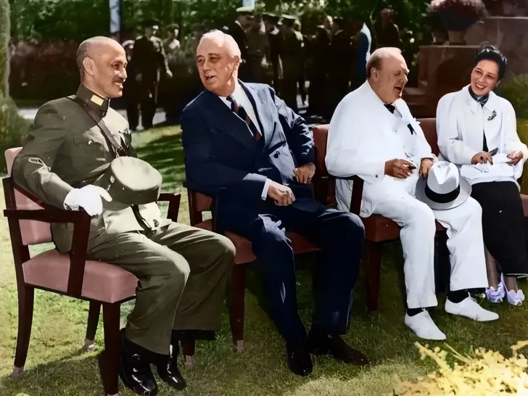 1943年11月25日,中美英三国首脑在开罗会议期间在开罗的米纳饭店外合影,从左至右分别为:蒋介石、美国总统罗斯福、英国首相丘吉尔和宋美龄。此为开罗会议的经典照片,被反复使用,也是中国在二战国际地位的象征。
