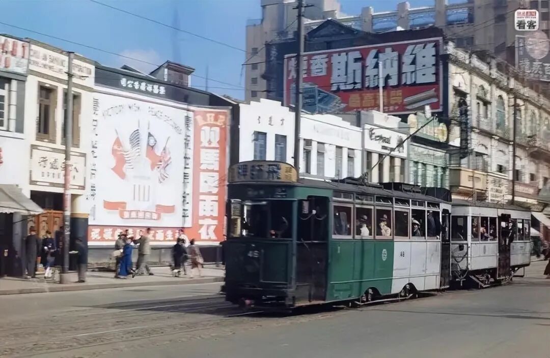有轨电车在战时及战后的许多年里一直行驶在南京东路上,其模样同美国、欧洲及印度的一些城市里的电车一样。街边那张巨型广告画,上面分别是中国、苏联、英国和美国的旗帜,以及“庆祝抗战胜利,庆祝世界和平”的标语。