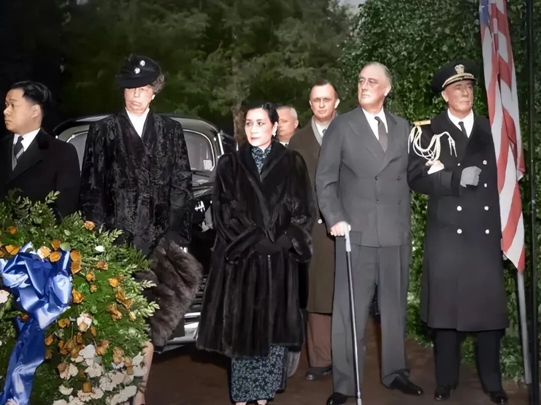 1943年2月22日,在宋美龄以罗斯福总统夫妇的私人朋友身份客居白宫期间,正值美国第一任总统乔治·华盛顿的210年诞辰,宋美龄与罗斯福总统夫妇一行拜偈了华盛顿墓。照片中从左至右分别为孔令侃、罗斯福总统夫人埃莉诺、宋美龄和罗斯福总统。