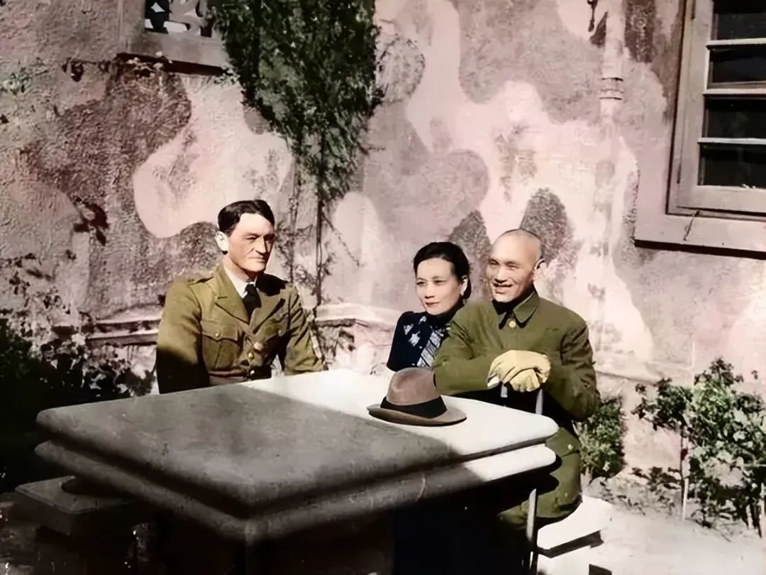 1942年,蒋介石、宋美龄夫妇访问昆明时,与驻扎在那里的航空志愿队指挥官陈纳德将军交谈。