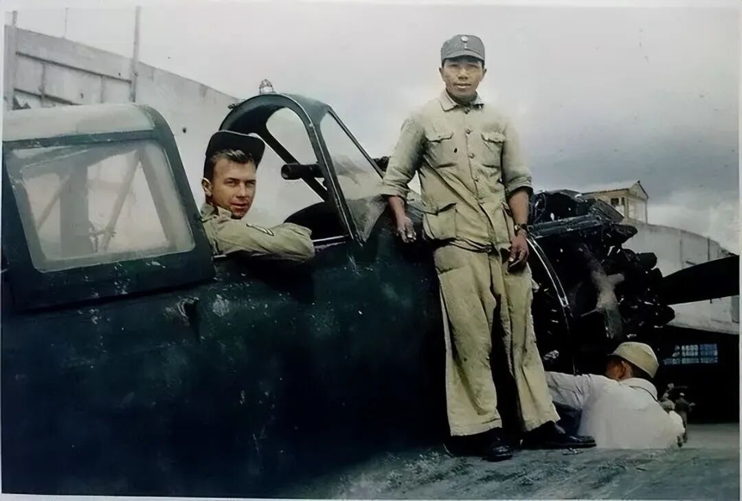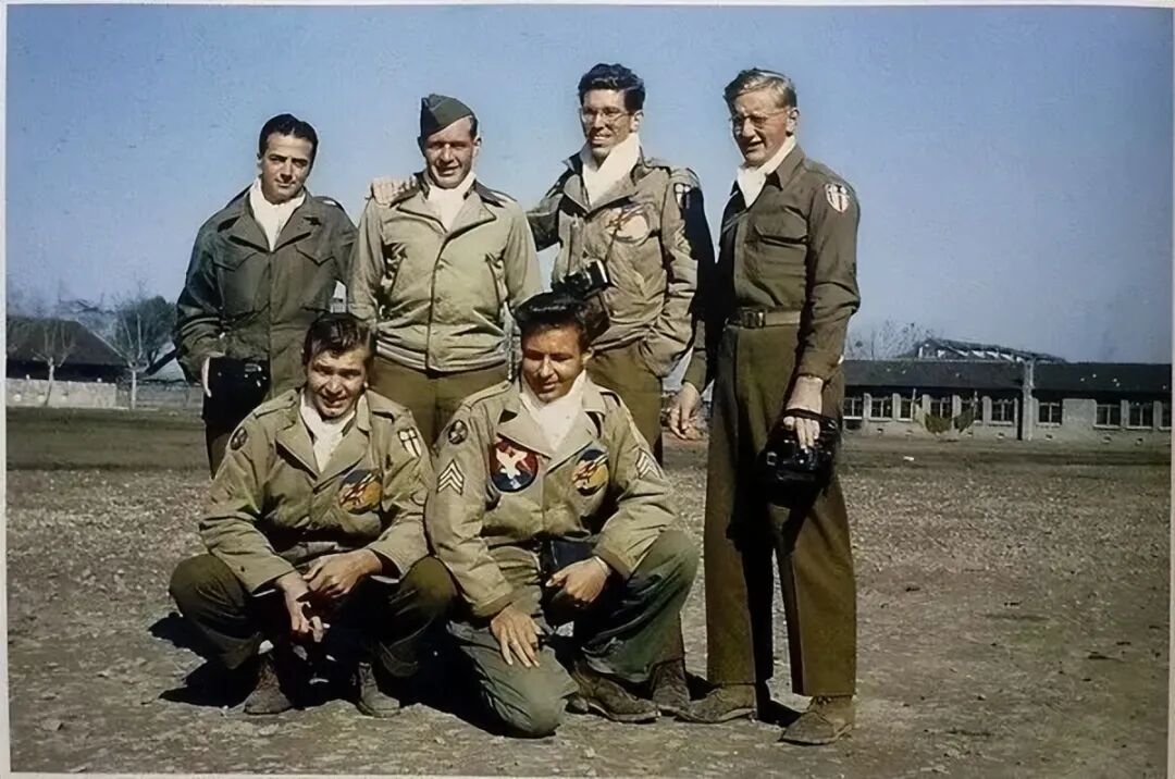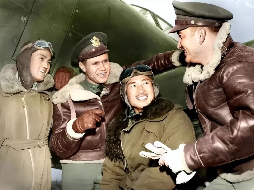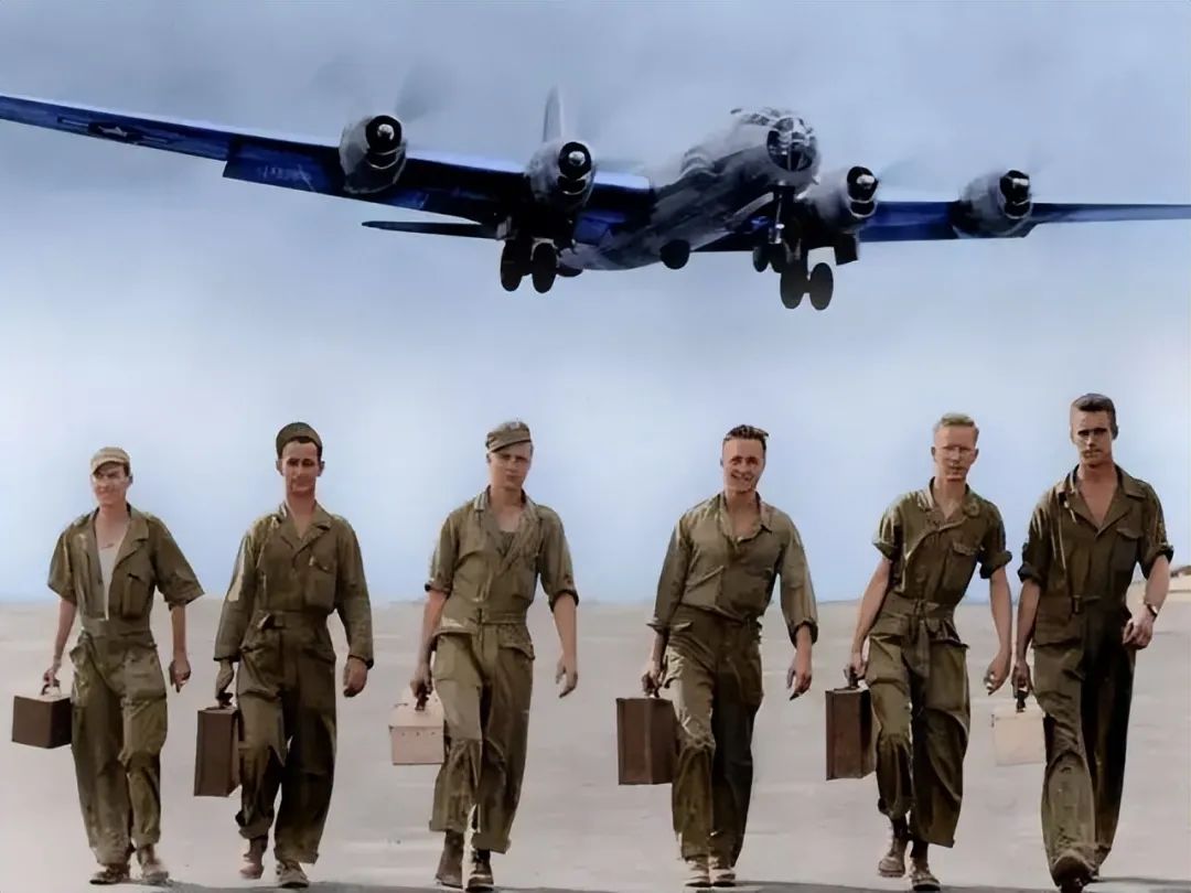 1944年9月15日,在中国的某处机场,一架B-29轰炸机在经过修复后重新起飞,之前这架飞机损失了两个引擎、一个起落架,弹仓也被打了好多弹洞。成功的修复全靠照片中这些来自美国的机械师,他们从左到右分别是弗朗西斯·达利军士、富兰克林·布莱恩军士、劳伦斯·沃那军士、兰帕德·沃那军士(他们是一对双胞胎)、乔治·克雷恩军士和尤金·菲力军士。美国在援助飞机的同时,还有大批地勤和机械师一同来到中国。