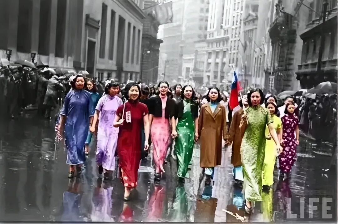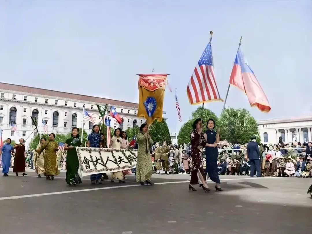 1943年3月25日,旧金山华侨小区的妇女,穿着传统旗袍,举着中美两国国旗,在宋美龄抵达市政厅的时候,举行了欢迎游行仪式。
