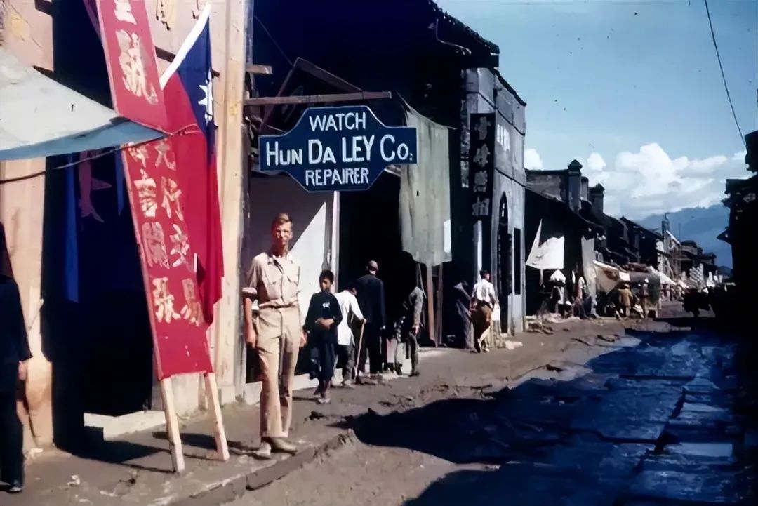 驻芷江的美军通讯兵约瑟夫在芷江南街钟表店前留影