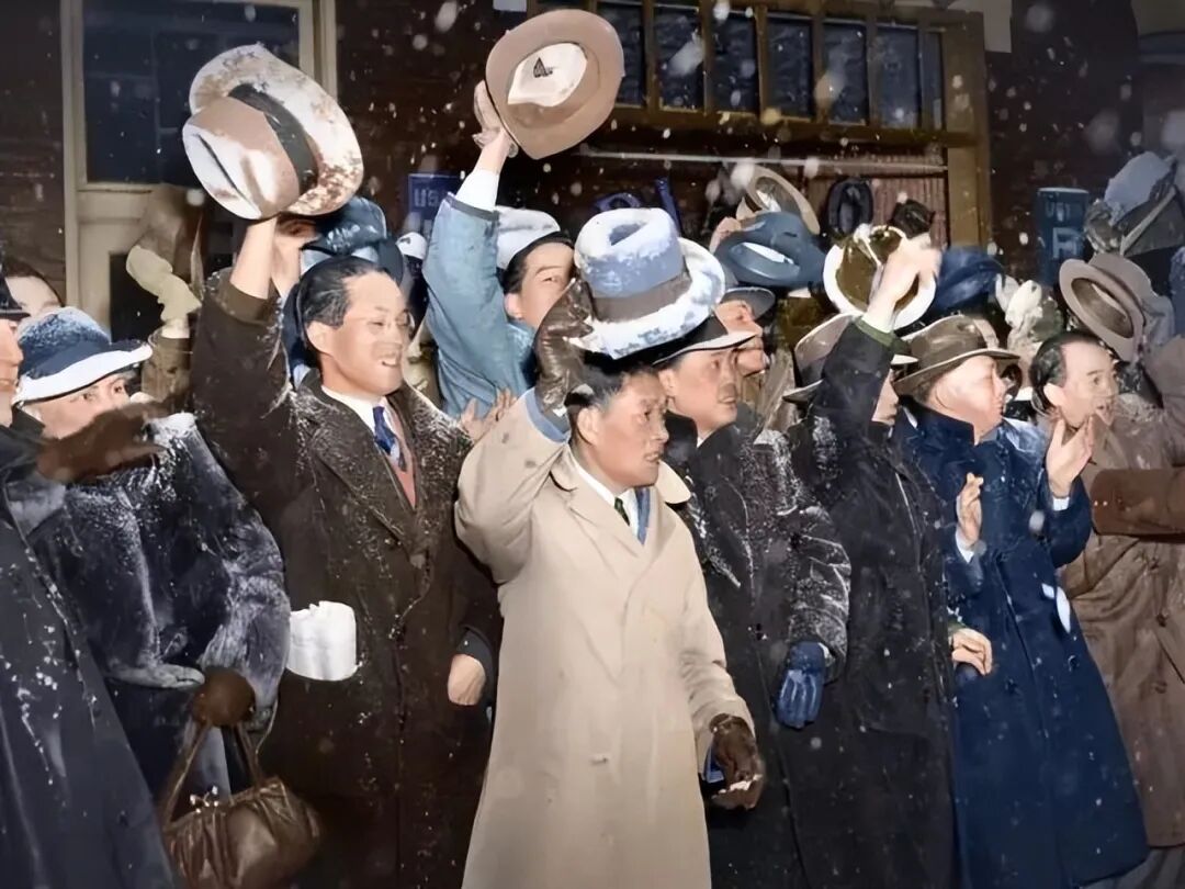 1943年3月,宋美龄结束与中国慈善协会的会议后走出纽约卡内基音乐厅,等候在路边的华人不顾大雪和严寒向宋美龄挥帽致敬。