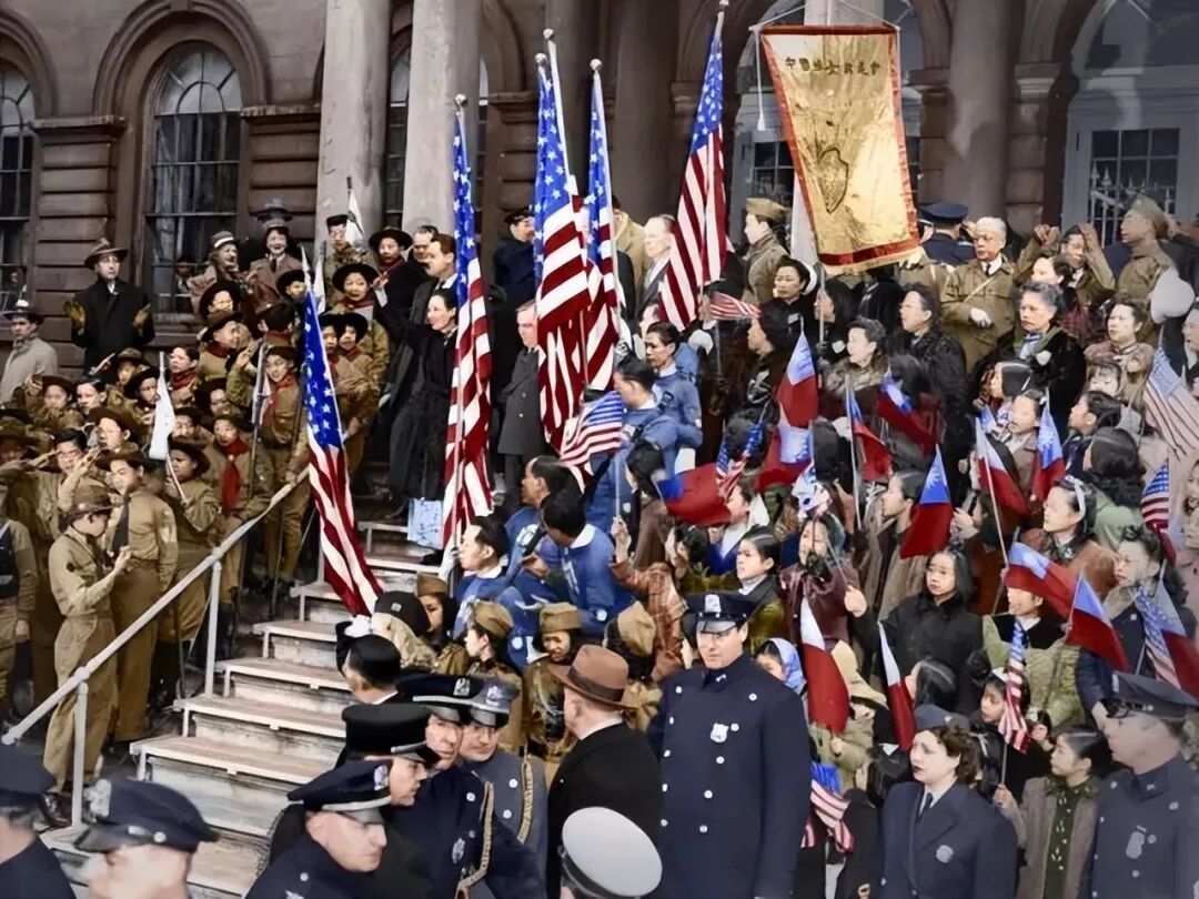 1943年3月1日,在纽约市政厅前的台阶上,宋美龄正向前来参加她的欢迎仪式的五万多名市民挥手致意,站在她旁边的是纽约市长拉瓜迪,童子军的华人男女童军手举两国国旗和标语分列楼梯两侧。纽约是美国东海岸华人最多的城市,这些身在异乡的中国人都关心着抗战,前来表达对中国抗战的支持。