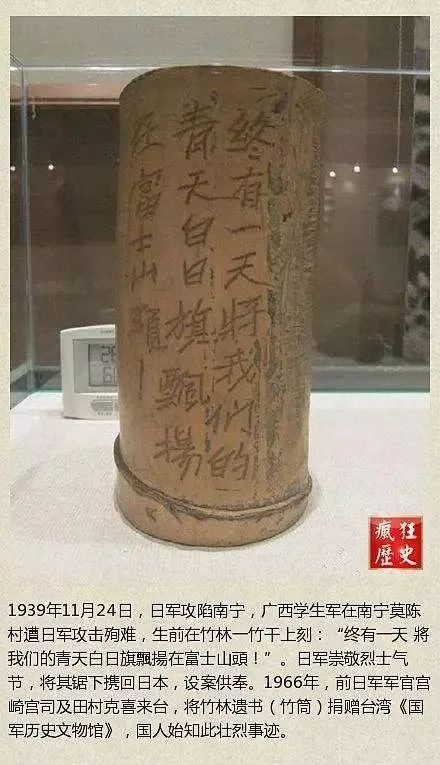 一名侵华日军敬仰这支桂军军学生军分队烈士的壮志,深受其豪气与爱国精神感动,将竹干锯下带回日本,设案供奉。