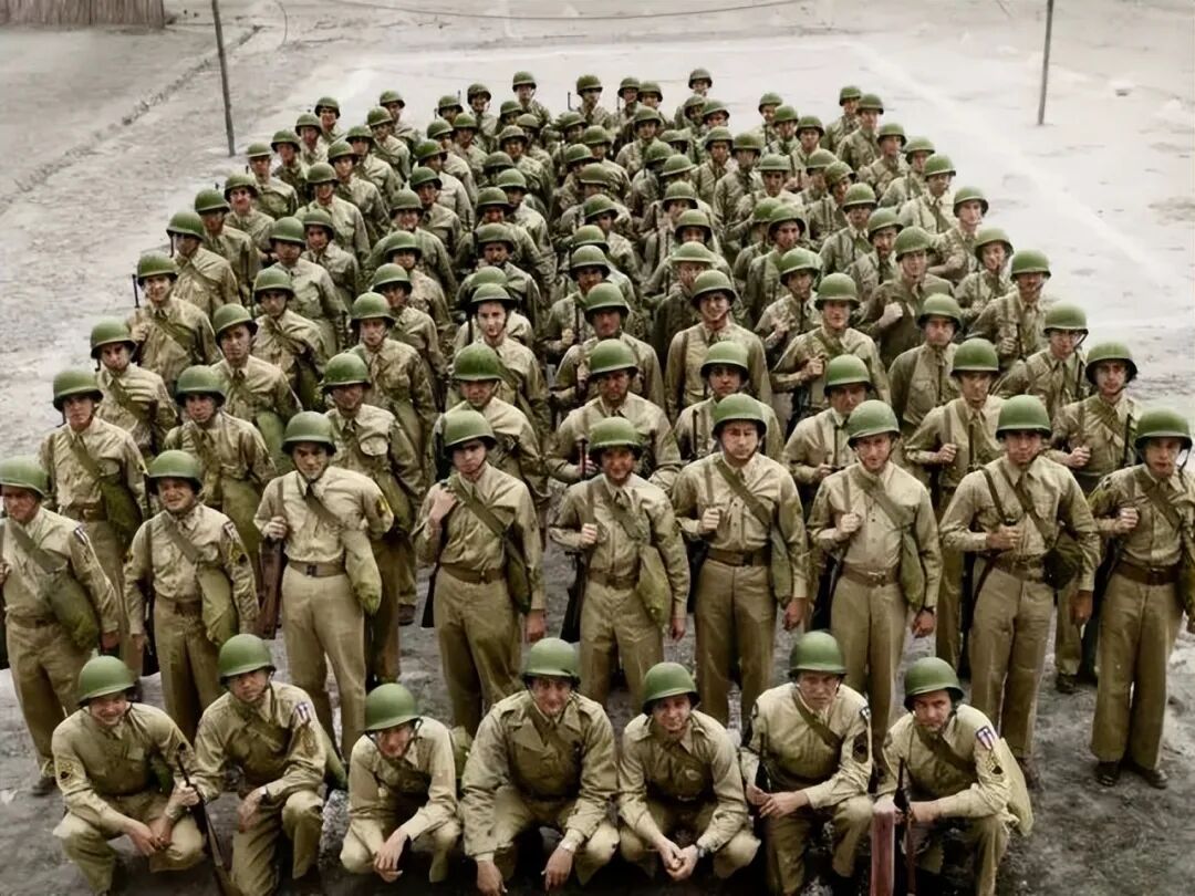1944年8月14日,第14航空队总部的美国官兵全副武装在训练场上合影。
