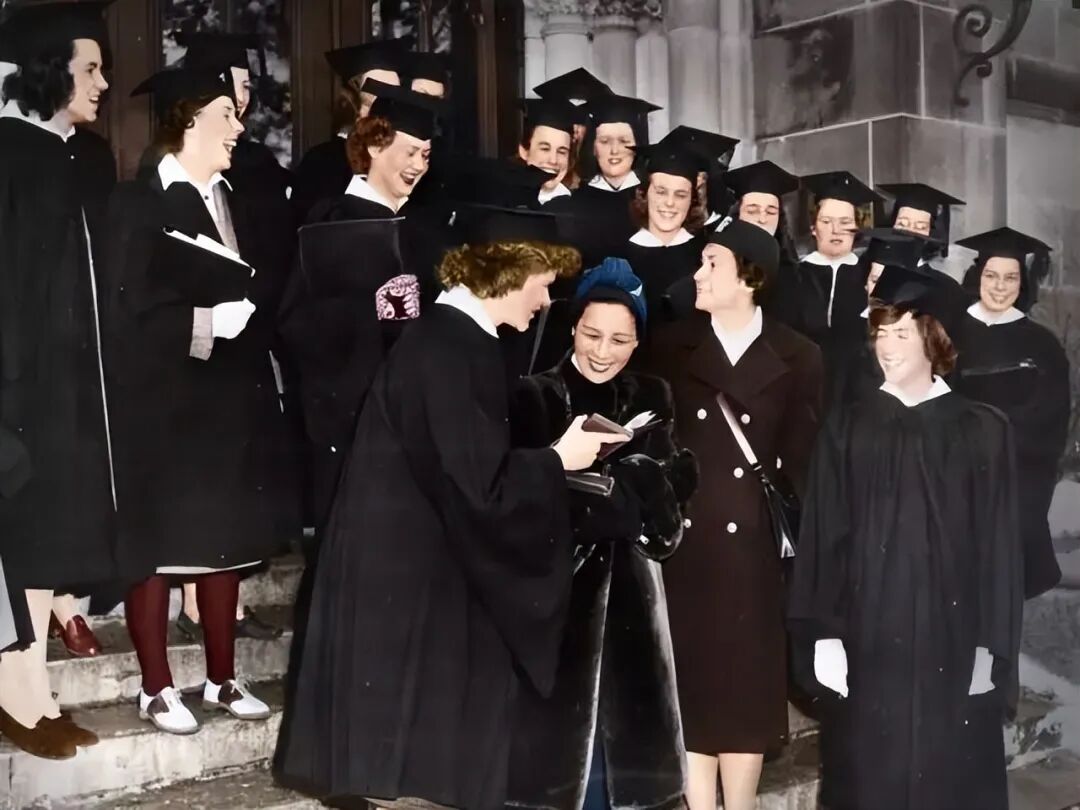 1943年3月,宋美龄回到自己阔别26年的母校韦斯利学院,受到热烈欢迎,这是她和众师生在韦斯利学院内的纪念教堂前合影,前排从左至右分别是学生会主席莎拉·摩尔、宋美龄、校长,也是美国海军中尉玛德瑞德·麦卡菲、韦斯利学院TZE社团主席海伦·韦伯斯特。TZE社团是该校的艺术与音乐社团,宋美龄在此求学期间曾是该社团的成员。