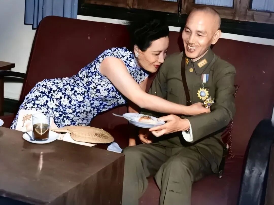 1943年7月7日,宋美龄在为蒋介石授勋的茶会上,斜过身子,靠在蒋介石身上看他刚获得的勋章