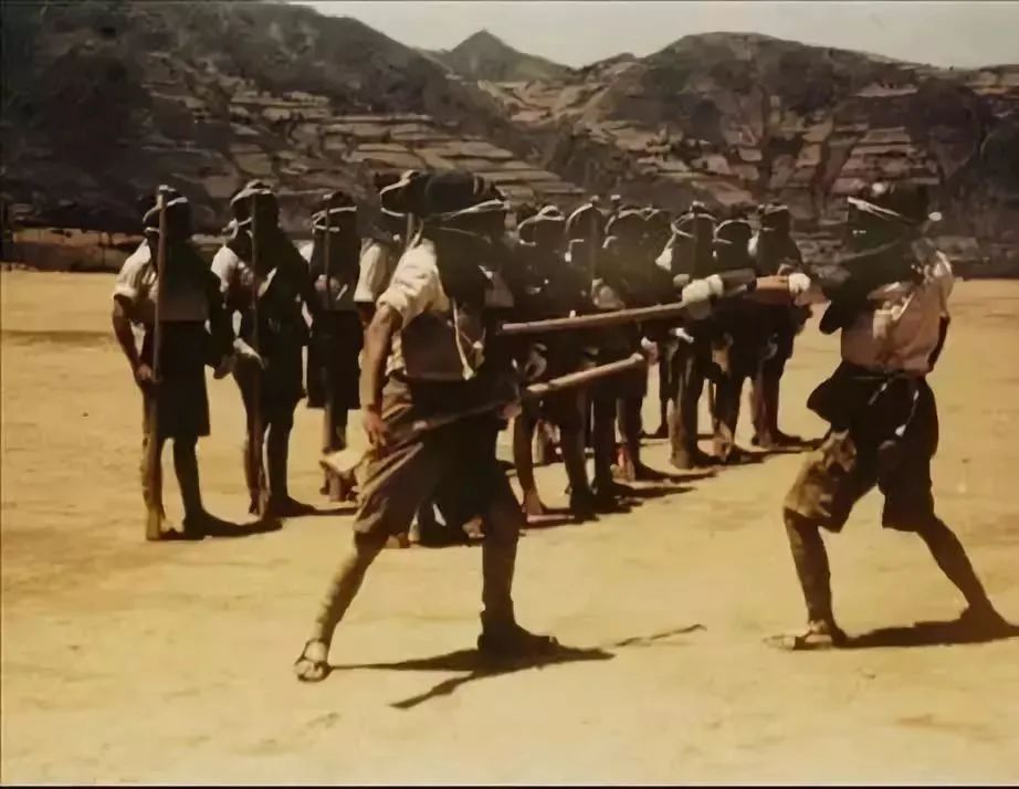 用木枪训练白刃战的的国军。头部和身躯上穿戴的是刺杀护具。