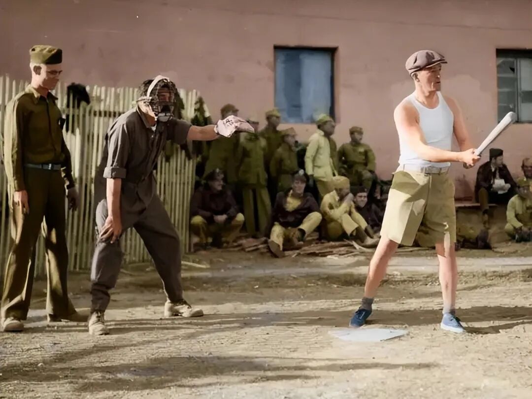 1943年6月,陈纳德将军戴着软帽,一身短打扮和第14航空队的成员们在基地打棒球。陈纳德1893年出生于美国得克萨斯州的康麦斯,拍摄这张照片的时候已经五十岁了,但他仍然十分强壮且精力充沛,可以连打9场球,这让他的对手和现场记者都非常敬佩。