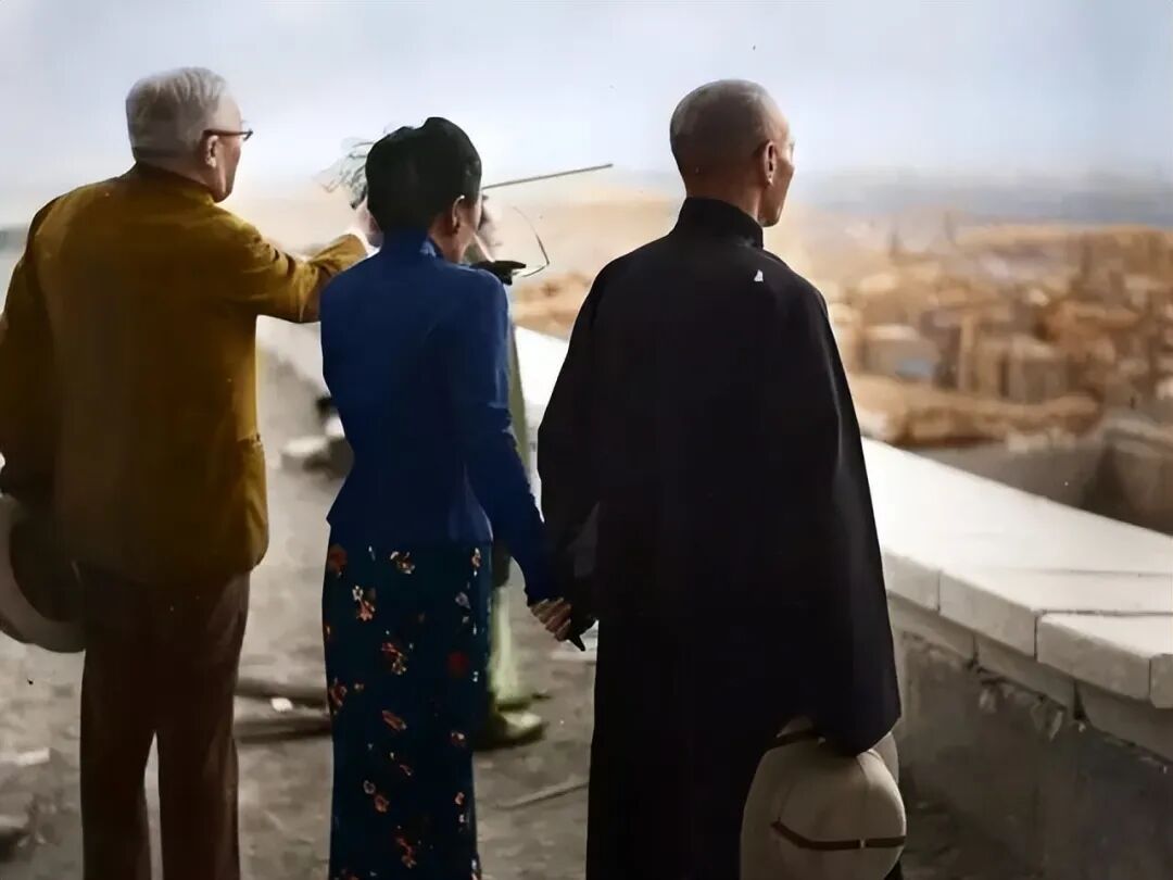 1943年11月27日,蒋介石宋美龄夫妇手牵手站在开罗某处古迹的楼顶,鹣鲽情深。在这里可以俯瞰整个开罗城,旁边的罗伯特爵士正用手杖指着城里某处讲典故。