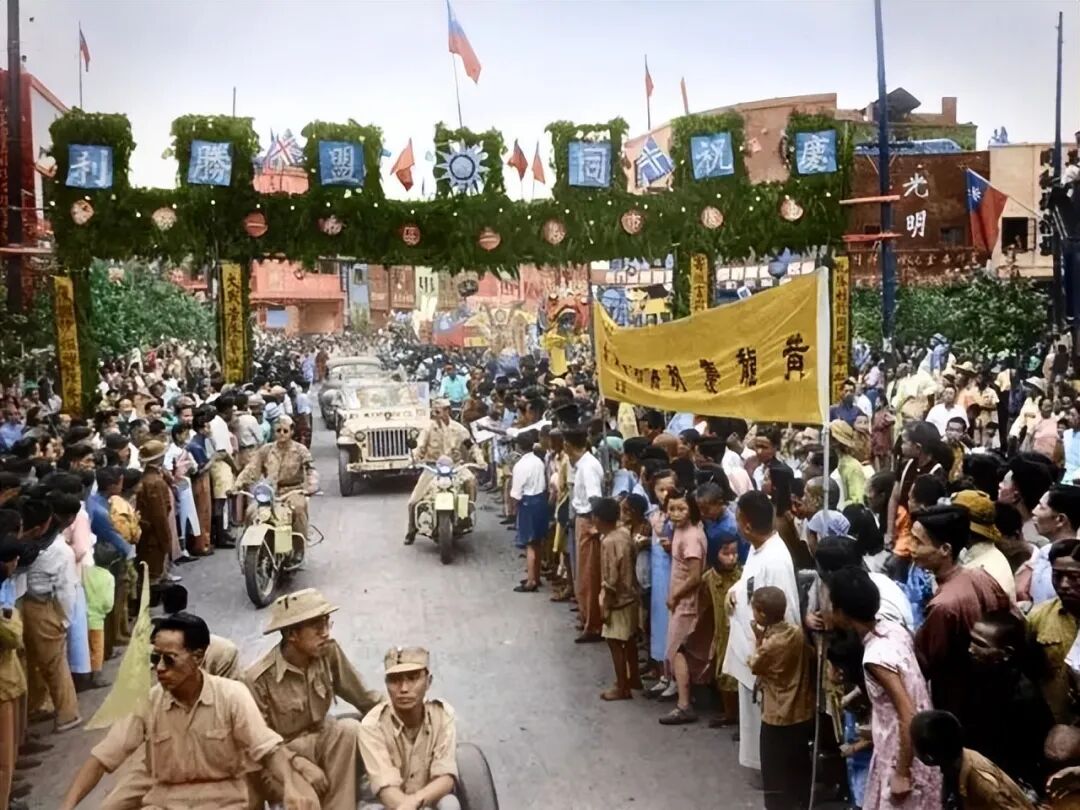 1945年年9月3日,日本投降后数日,重庆首次举行大规模的胜利游行,共有四万多人参加,热闹非凡,犹如嘉年华会。队伍由在重庆美军骑着摩托车担任前导,并高举中美英法苏五国的国旗和肖像。
