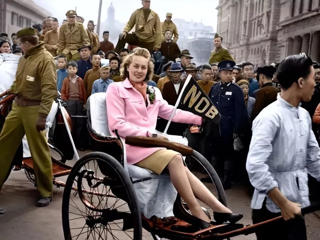 1946年8月27日,在美军机场工作的这位女士,趁闲暇时间去重庆体验人力车,车夫的头发在头油的帮助下一丝不苟,闪闪发亮,围观的百姓很多,甚至不乏美军军官。