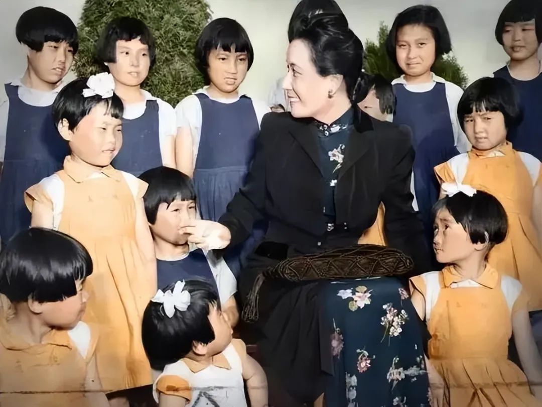 1944年5月2日,宋美龄在参观完坐落在重庆的中国战时儿童保育会后与那里的孤儿女童合影。