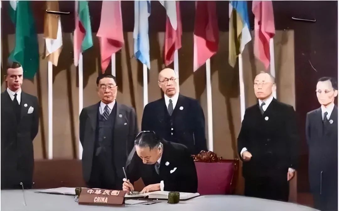 1945年7月4日,出席在旧金山市召开的国际组织联合国会议的中华民国代表团成员在《联合国宣言》签字仪式上,中国成为联合国五常之一。