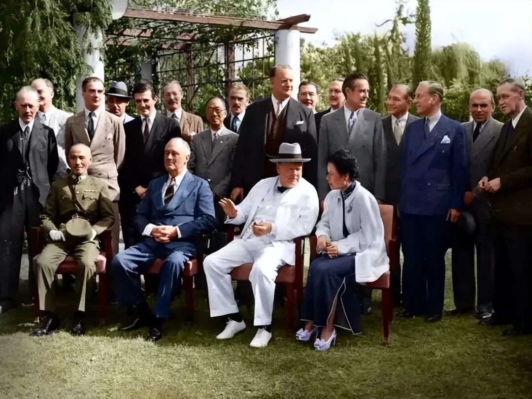 1943年11月25日,中美英三国首脑及他们的重要幕僚在开罗会议期间于米纳饭店外的草坪上合影。由于蒋介石不谙英语,由宋美龄担任翻译。