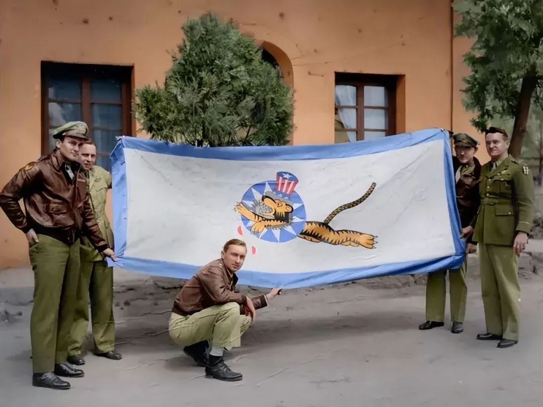 1943年3月30日,驻华特遣队的队徽,右起为陈纳德将军及后来担任中美混合团第三大队长的斯崔克兰上校(H. E. Strickland)、哈乐威中校(B. K. Halloway)、鲍穆尔少校(Albert J. Baumler)与文生上校(C.D. Vicent)。