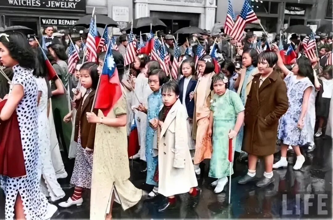 1943年4月,在欢迎宋美龄一行抵达旧金山市的游行活动中,四位小朋友走在队伍中间,其中两个小朋友穿着传统的中式长衫戴着瓜皮帽,还有一个小朋友扮成“山姆大叔”的模样,充满了自豪与自信,这种中美混合风也是旧金山市唐人街生活的写照。