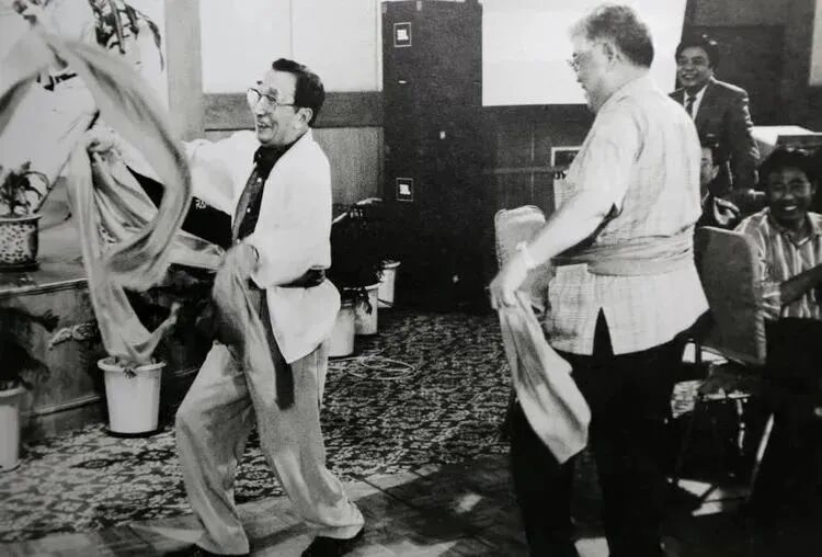 刘炽也是从延安鲁艺走出来的老艺术家,由他作曲的大量歌曲如《我的祖国》、《英雄赞歌》、《让我们荡起双桨》等,都深受群众的喜爱。大家也许见过刘炽弹钢琴,可看到过他扭秧歌吗?牛群所拍的这张老照片,着实令我们大开眼界。