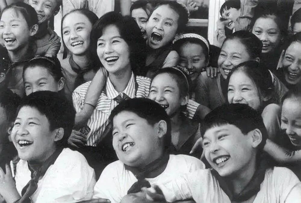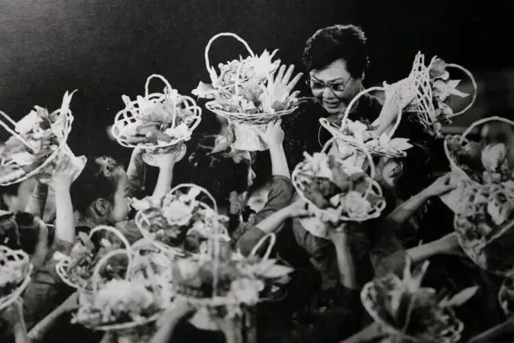“花篮的花儿香,听我来唱一唱……”我觉得这张老照片,也抓拍得很好,很有意义。这是表演艺术家郭兰英再一次唱起《南泥湾》时,孩子们争相为她献上花篮的照片。