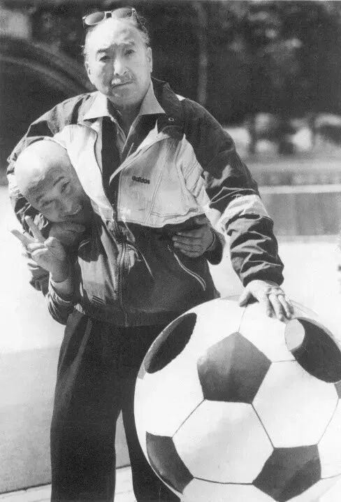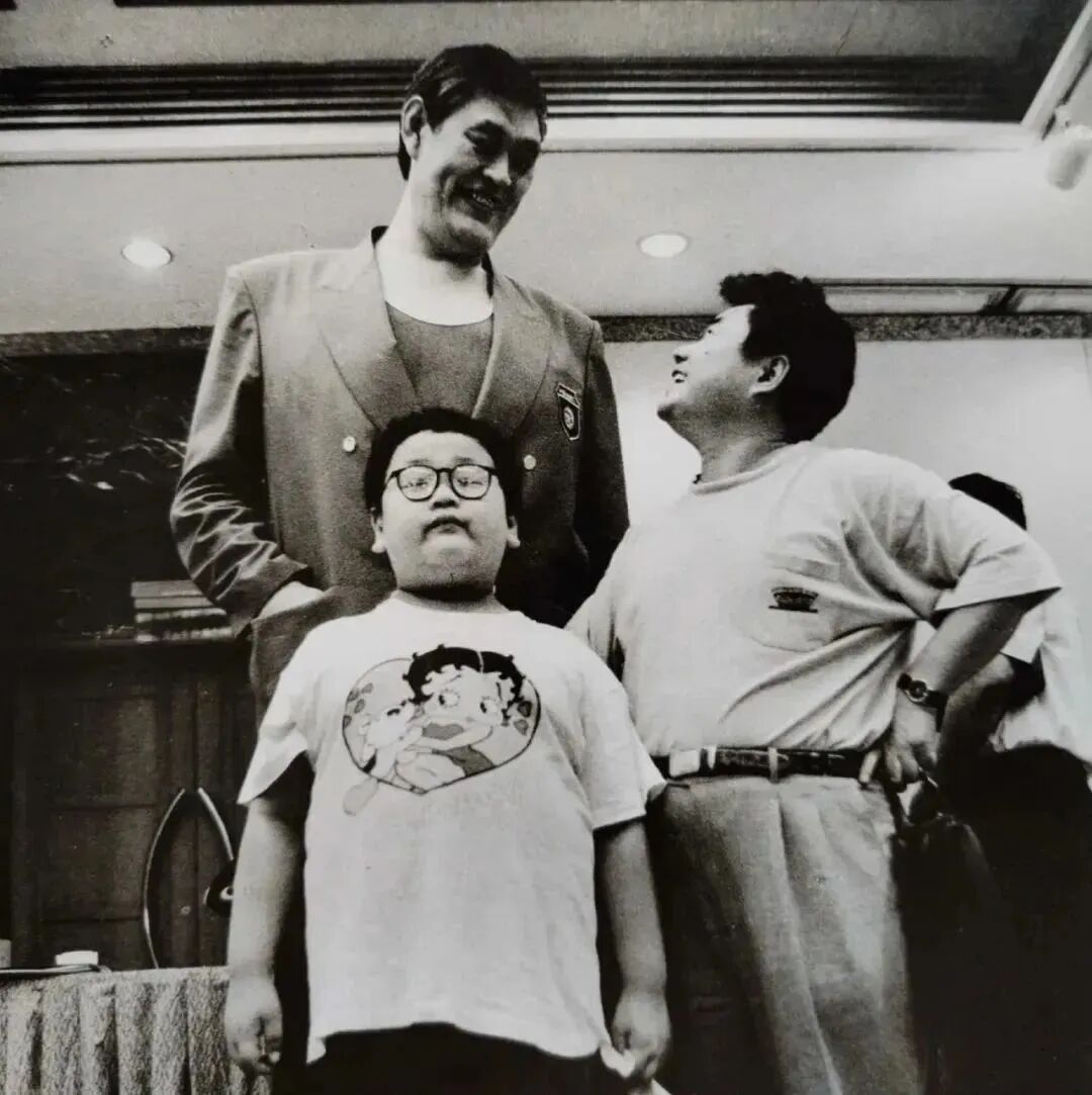“巨人”穆铁柱,旁边是音乐人徐沛东。穆铁柱身高2米28,比姚明还高两公分。他男篮生涯的辉煌时期我基本没赶上,但从小在相声和喜剧里总听到穆铁柱的名字,一直认为他就是负责个子高的,并没有干什么,多年后才知曾是男篮中锋。