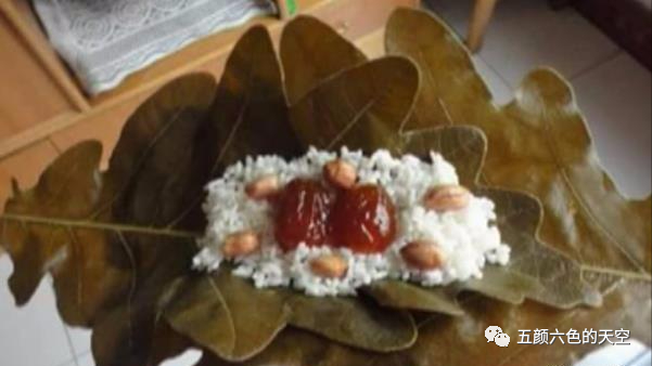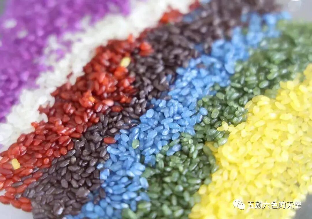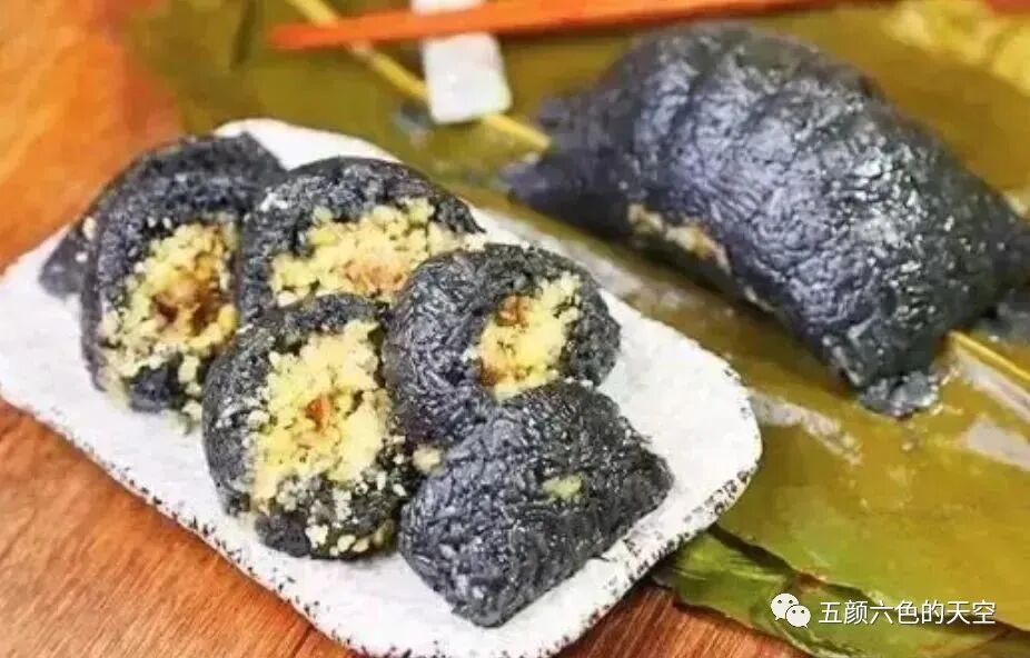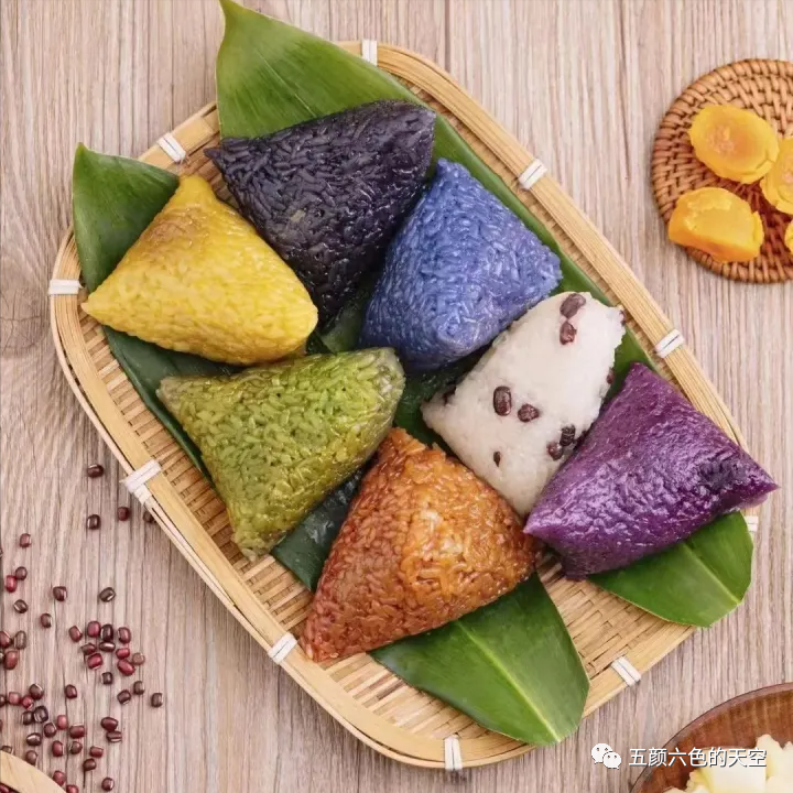 五色中的白色来自于糯米本身的颜色,然后用枫叶、红蓝草、黄花、紫番藤将米分别染成黑、红、黄、紫4种颜色。植物染后,粽子五颜六色,不仅颜色漂亮,还各有清香,看了都想尝一口。